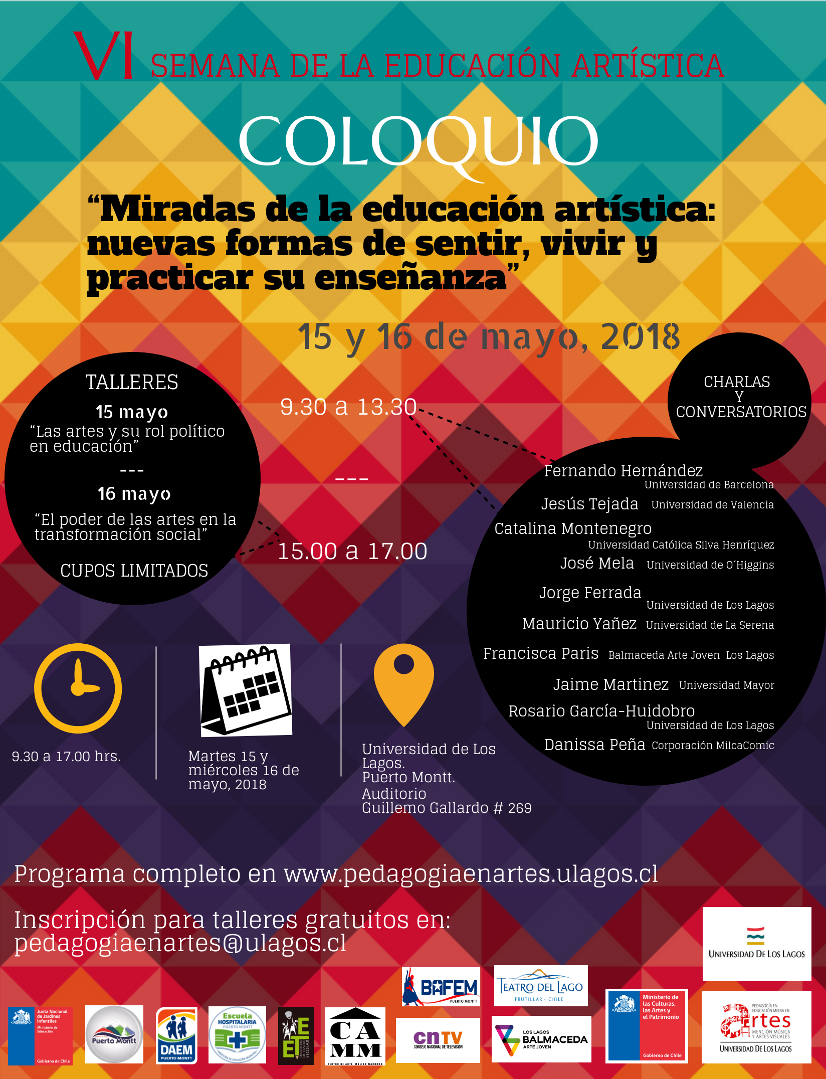 Los días martes 15 y miércoles 16 de mayo se realizará el Coloquio "Miradas de la educación artística: nuevas formas de sentir, vivir y practicar su enseñanza”, en el marco de la Semana de la Educación Artística que celebramos en la Región de Los Lagos. Contaremos con la presencia de diversos especialistas chilenos(as) en el área de la educación artística y musical en nuestro país. Además contaremos con la participación virtual, vía streaming, de dos académicos españoles, quienes realizarán vídeo conferencias. También se desarrollarán talleres prácticos gratuitos, orientado a las artes visuales y la música, que permitan poner en práctica los aspectos dialogados.